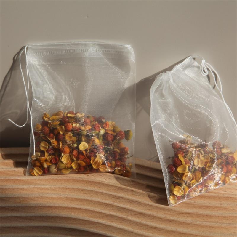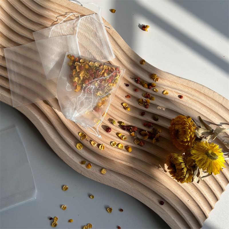 Nylon möskva tómur tepokinn er hentugur fyrir lauf te, en ekki fyrir duft te. Það er ódýrt og hentar jurtalækningum og laufstevélum. Það er hægt að innsigla það með hitaþéttingu.